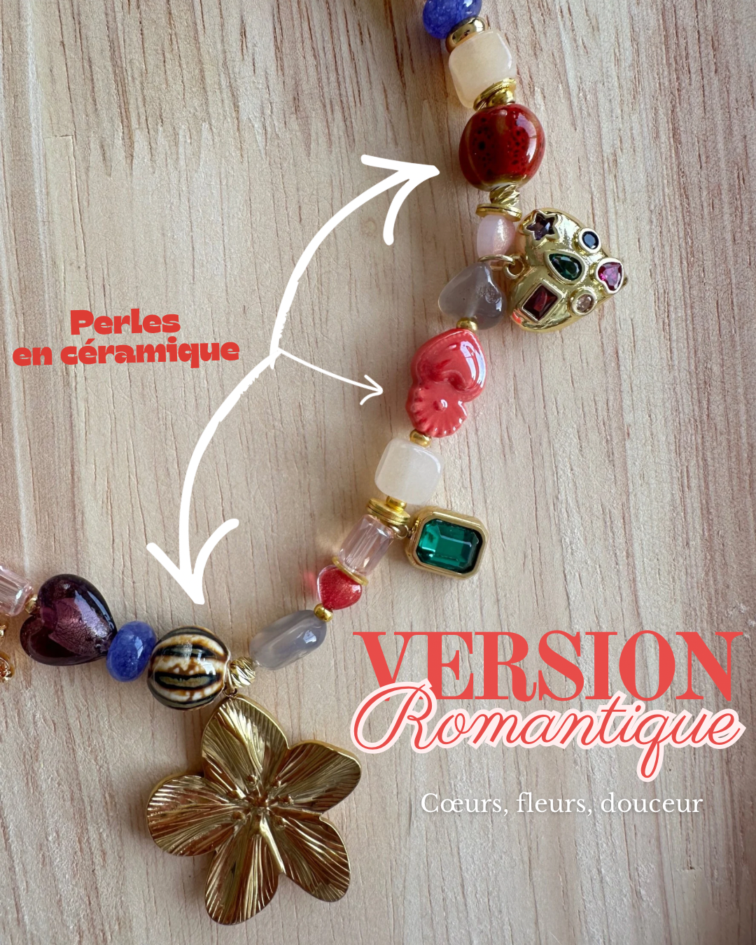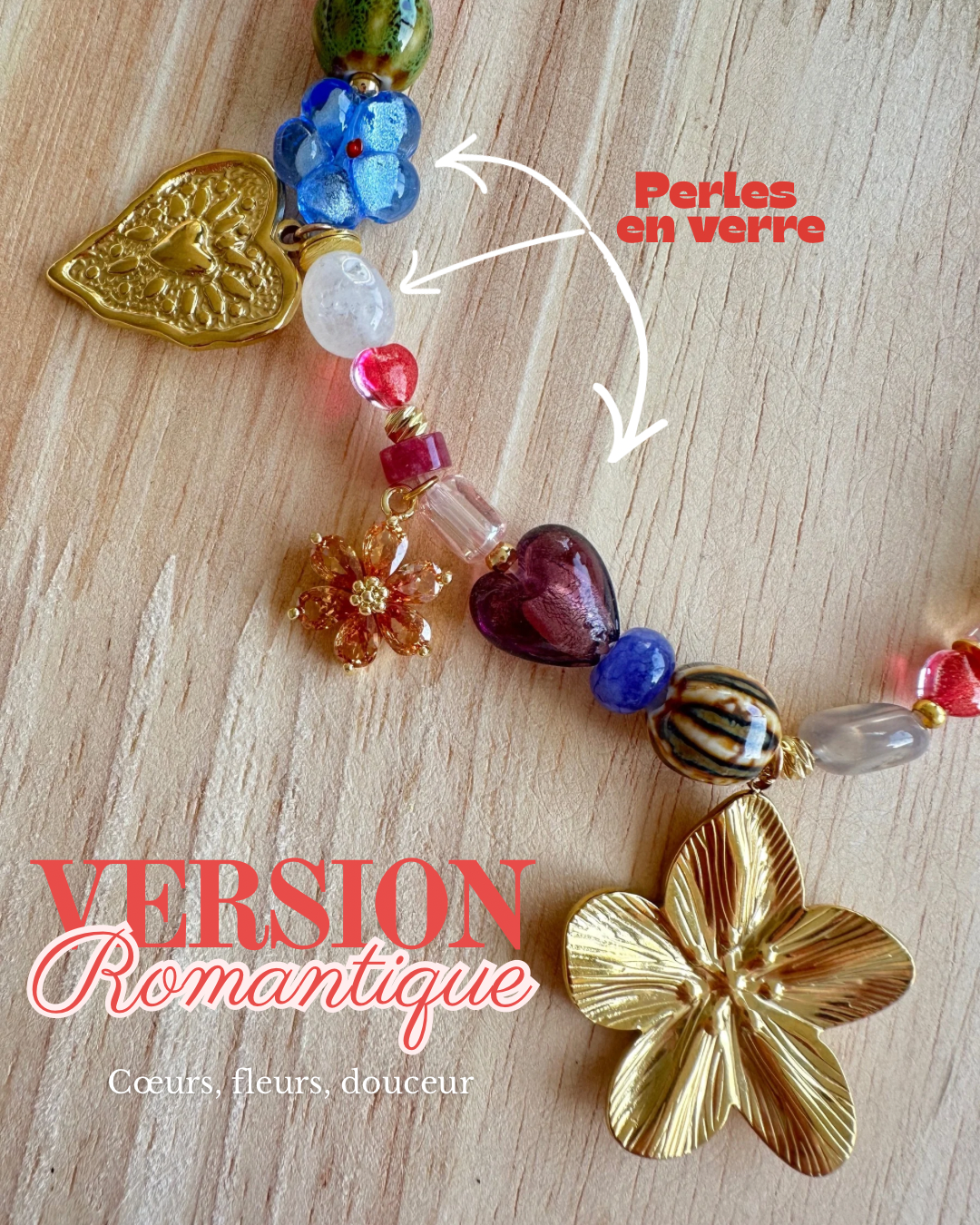 La Créative est un collier fait main, coloré et plein de caractère. Il associe perles en verre, perles en céramique et pendentifs dorés pour un bijou unique et expressif.
