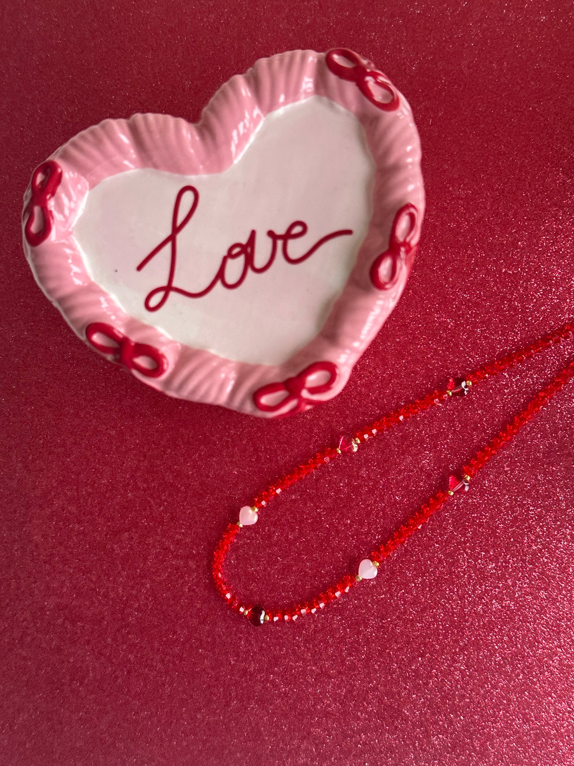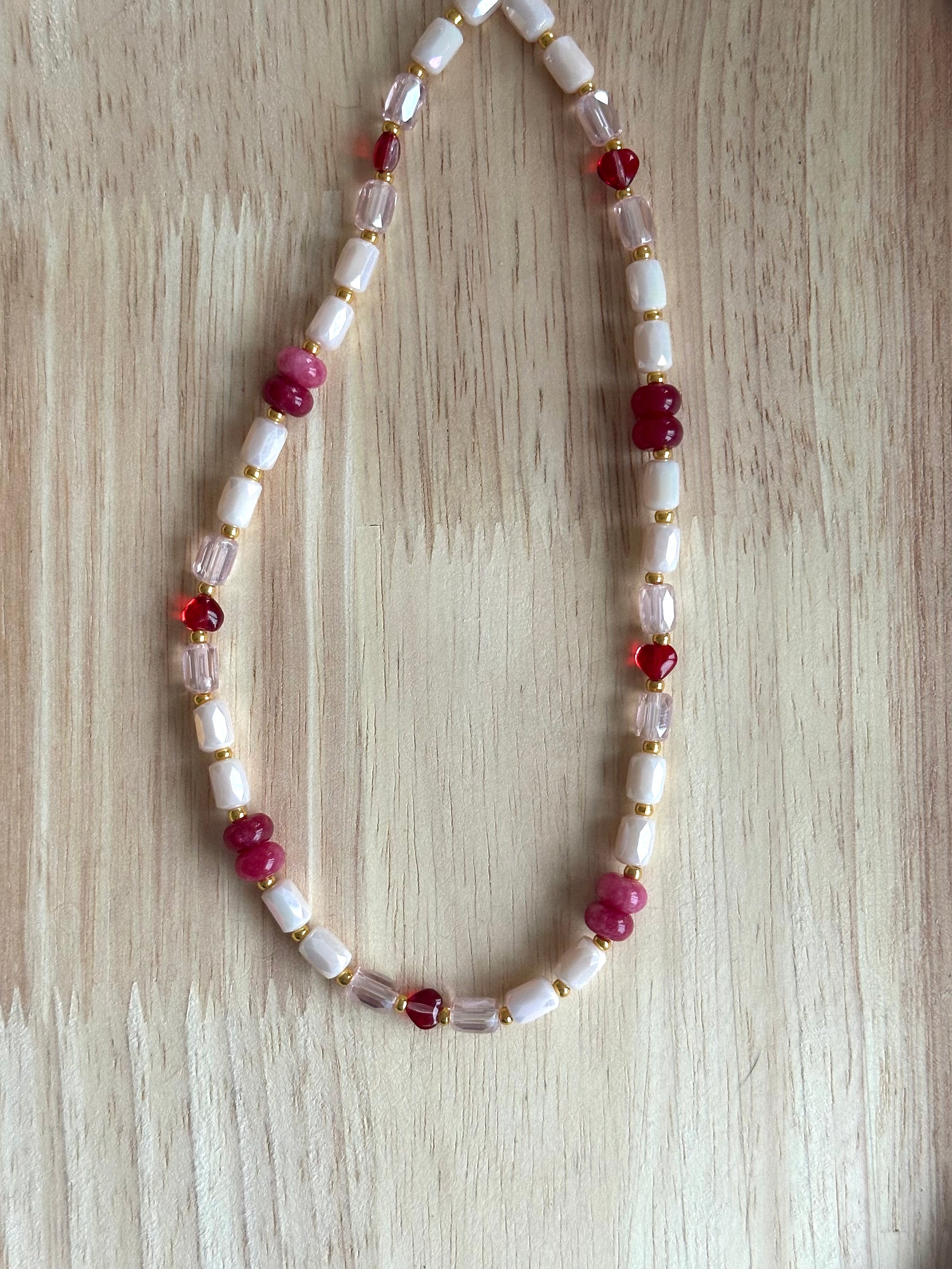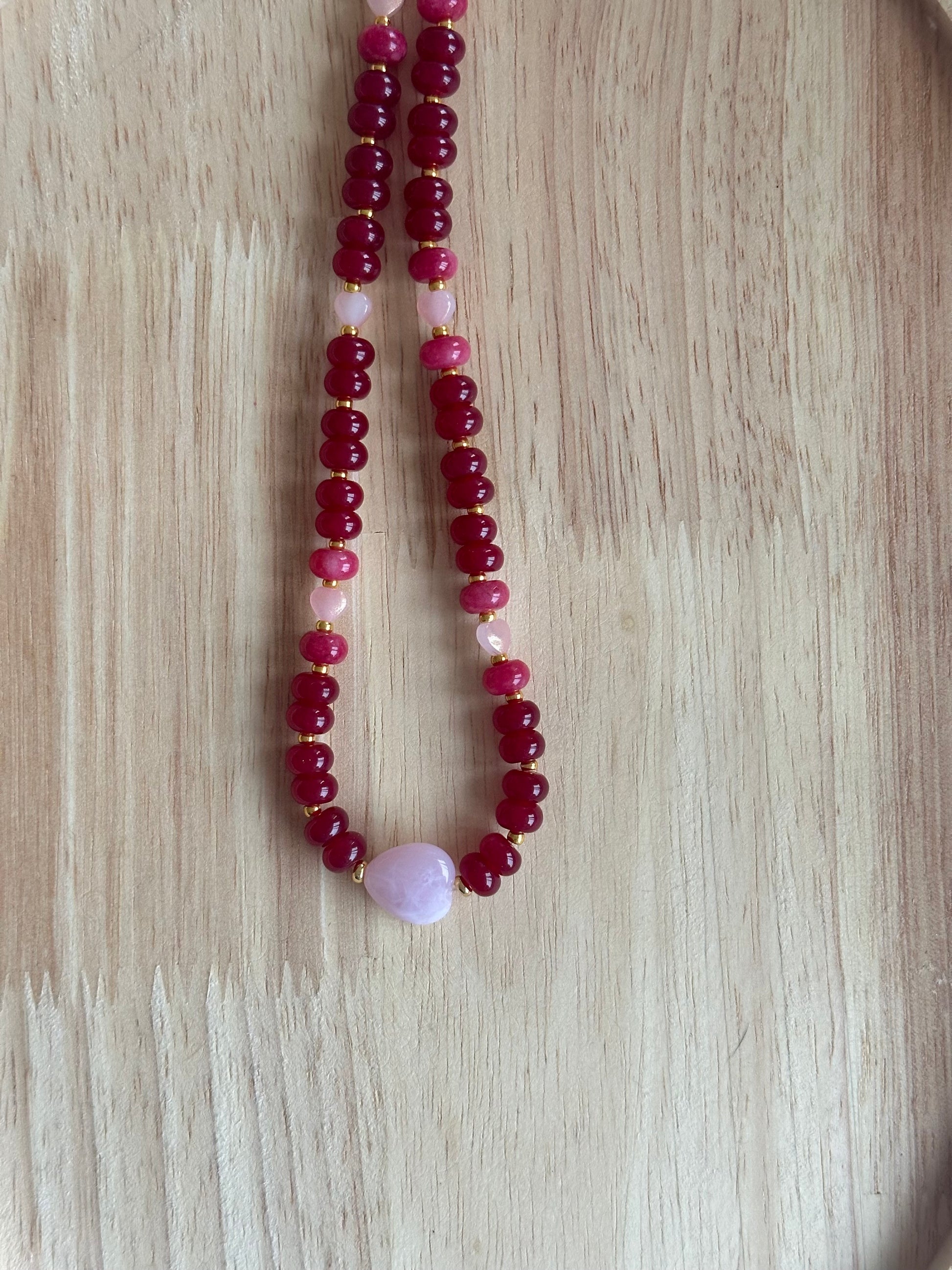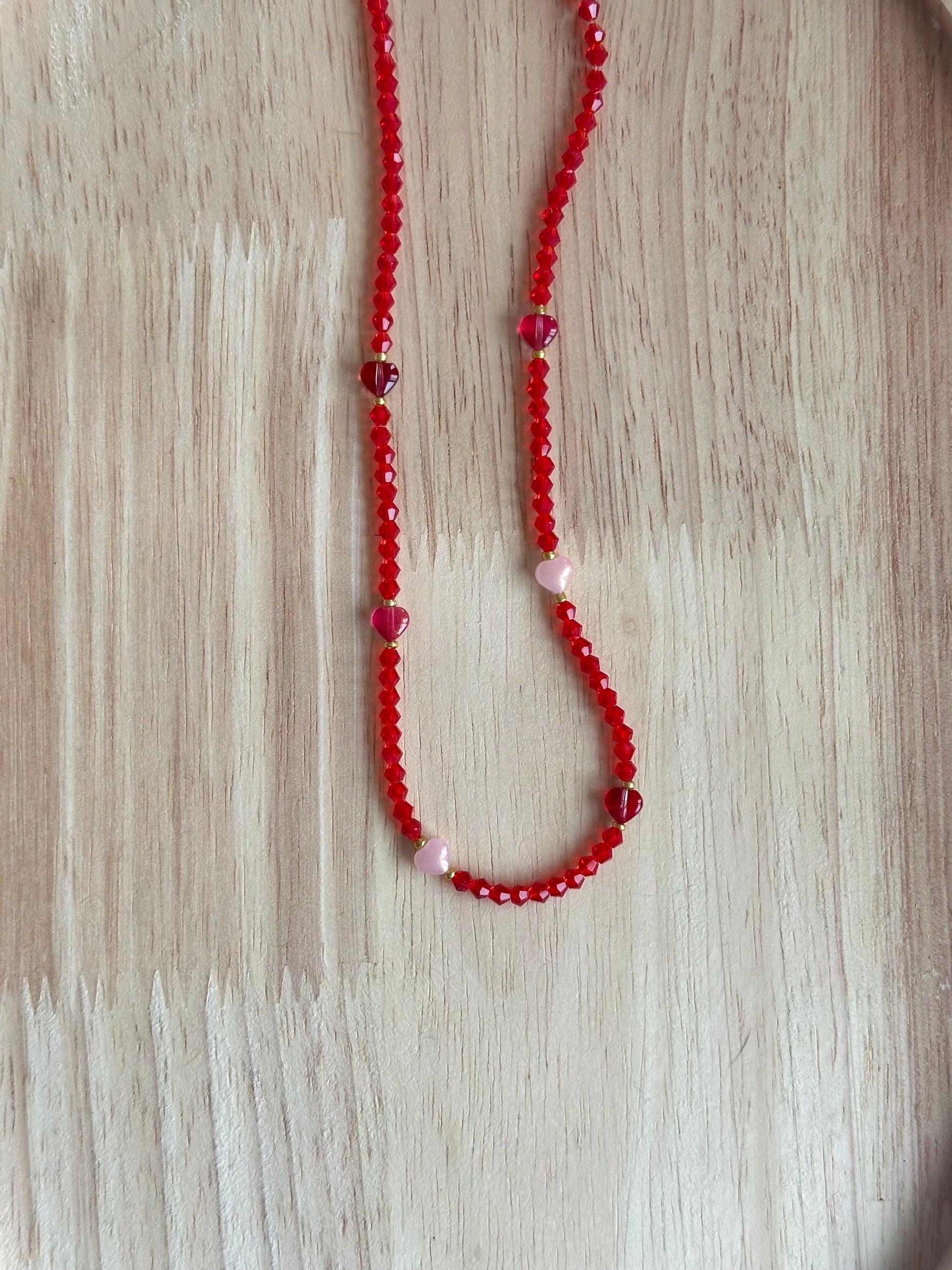 Colliers délicats et lumineux, pensés pour sublimer le quotidien avec simplicité. Selon les modèles, il est composé de perles en verre et de cœurs décoratifs en plastique, dans des nuances rosées et rouges.