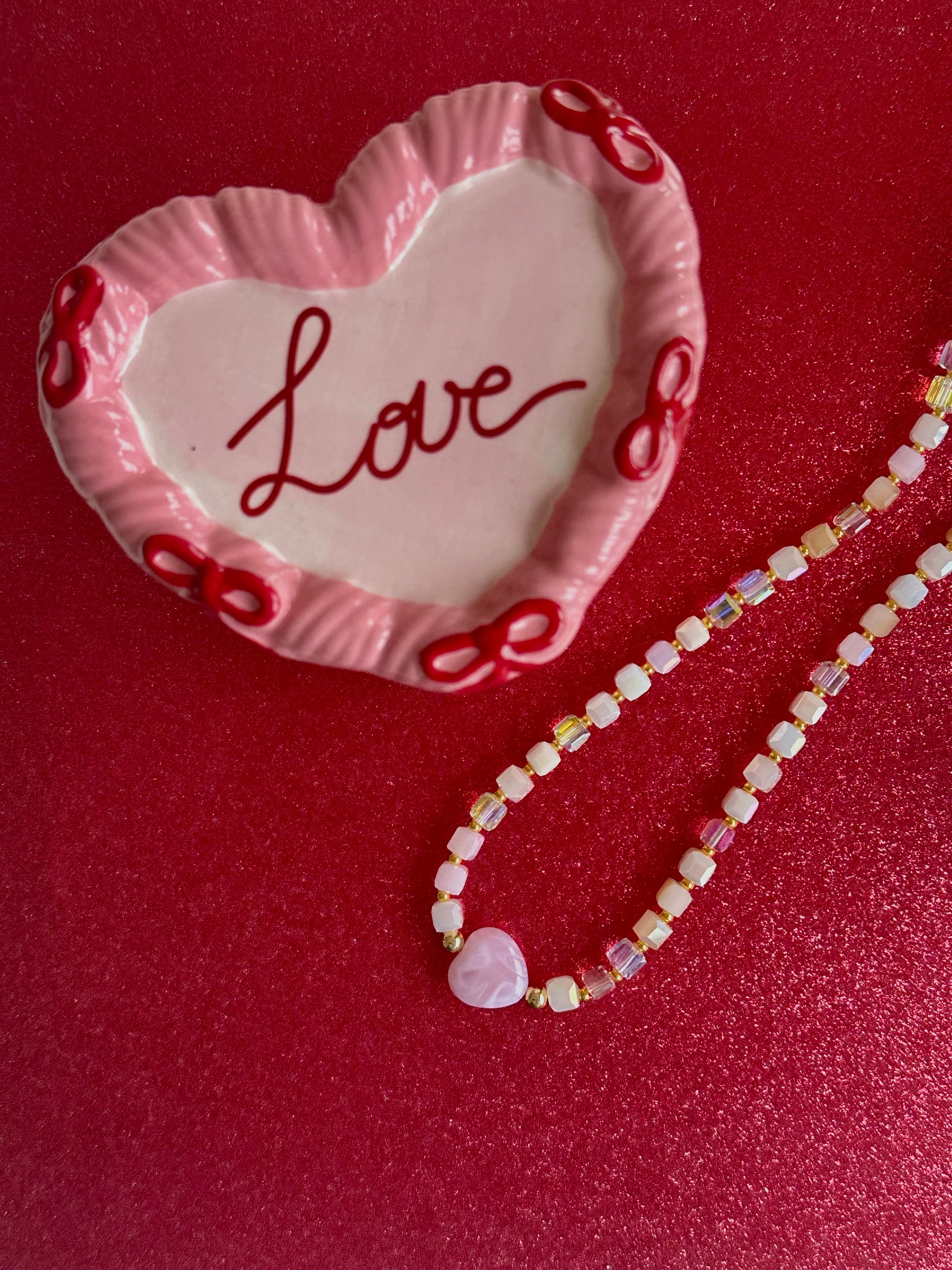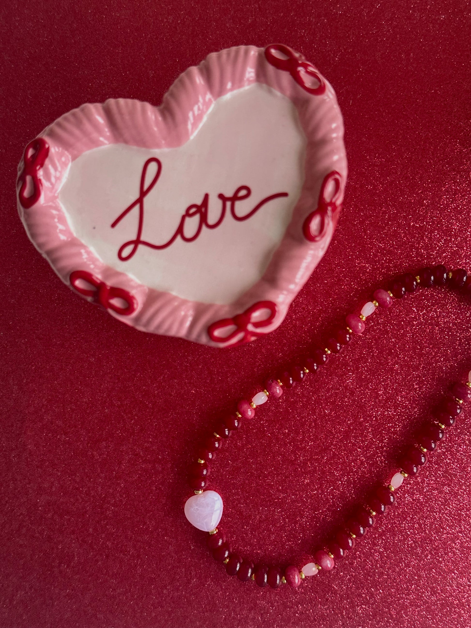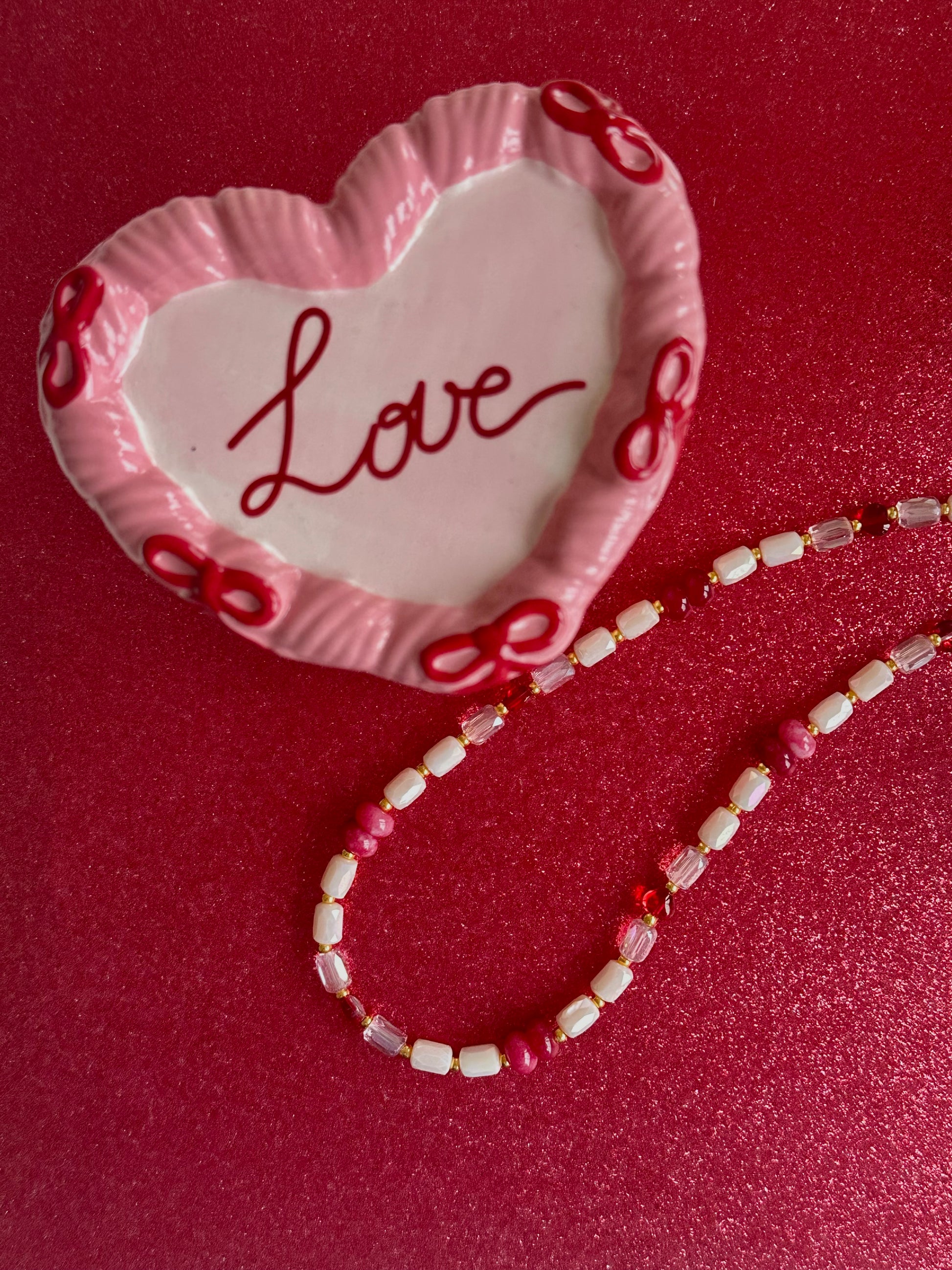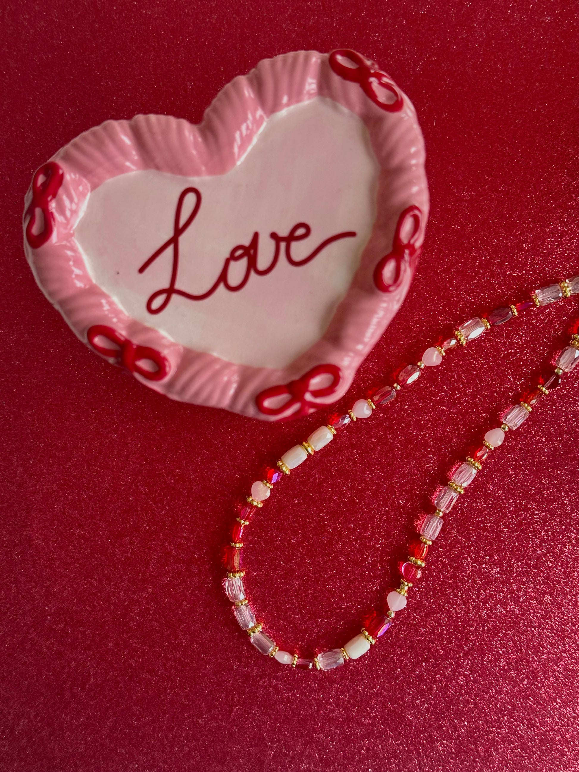 Colliers délicats et lumineux, pensés pour sublimer le quotidien avec simplicité. Selon les modèles, il est composé de perles en verre et de cœurs décoratifs en plastique, dans des nuances rosées et rouges.